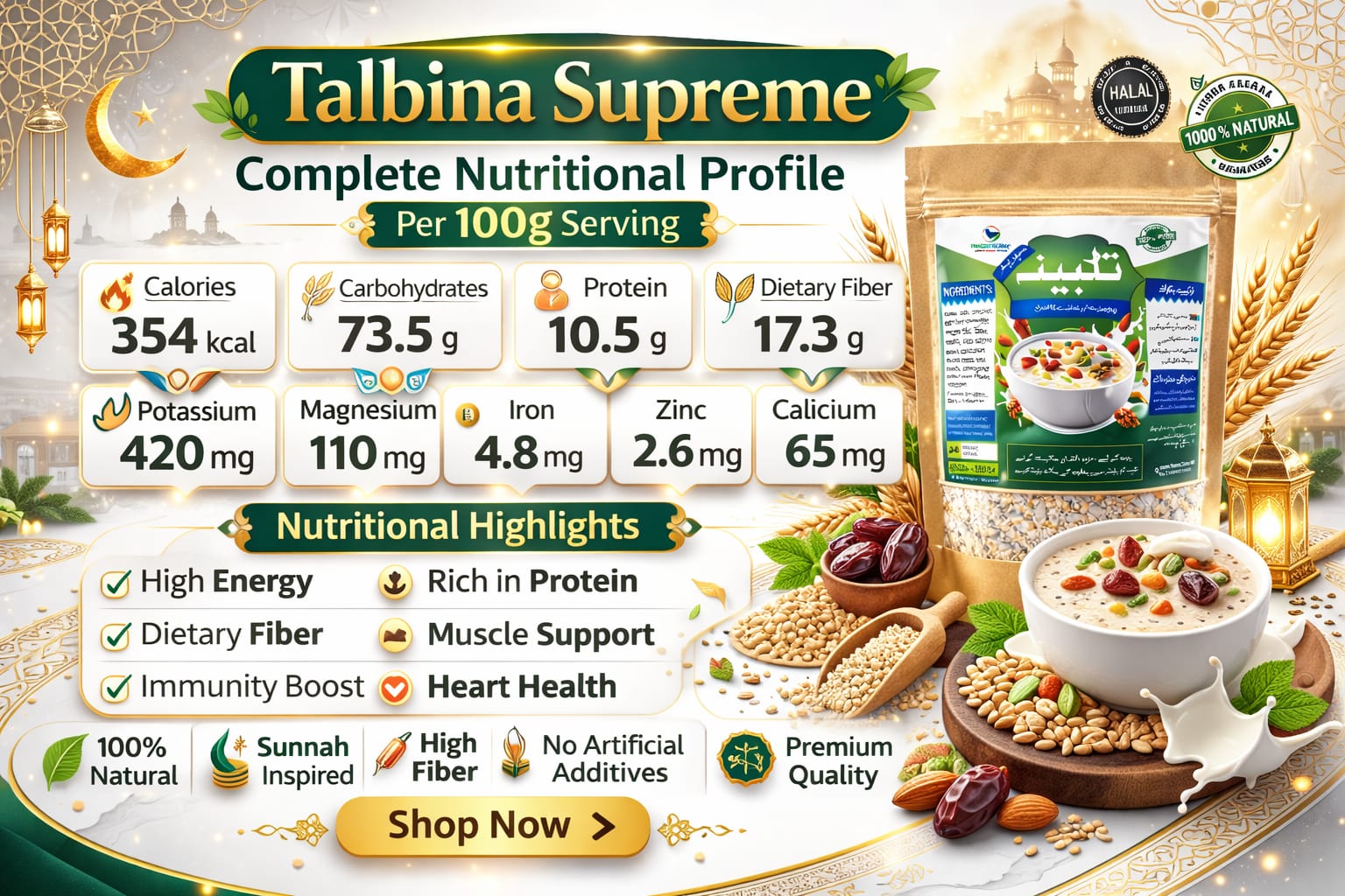 یہ Talbina Supreme کا بہترین ویلیو بنڈل ہے جو پورے خاندان کے لیے قدرتی غذائیت اور روزانہ توانائی کو سپورٹ کرتا ہے۔ ہاضمے کے لیے مفید اور روزانہ استعمال کے لیے ایک بہترین انتخاب۔